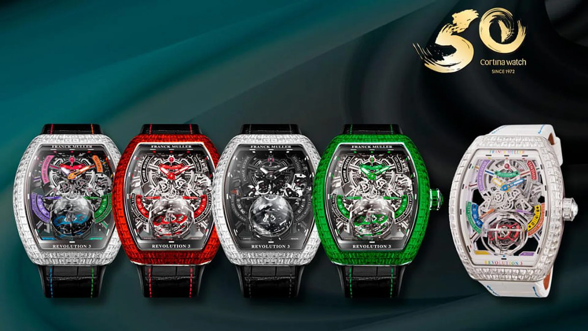 在Cortina Watch 50周年之际,法穆兰(Franck Muller)在Vanguard Revolution 3腕表的基础上推出了一套五款独特的腕表。