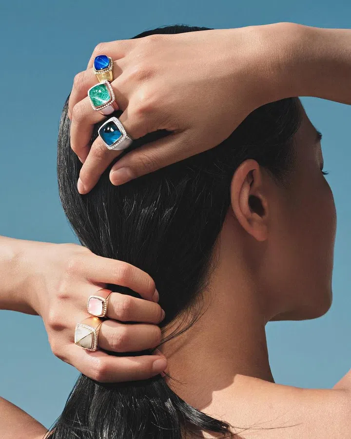 FRED充满辨识度的Pain de Sucre系列,以品牌创始人热爱的巴西地标糖面包山为设计灵感。通过特殊的宝石切割,让戒指巧妙展现宝石光影变化的迷人之处,最特别的是当中的珠宝是可更换式,让佩戴者自由组合不同颜色的珠宝,为造型增添个性态度。柔和的弧面让宝石尽展内在美感和绚丽色彩,系列新推出的青金石和天河石款式,进一步体现FRED对宝石美感的精深造诣,以充满活力的宝石色彩,传递乐观豁达的精神。