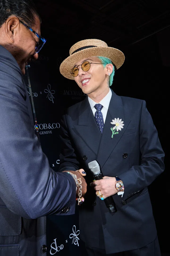 GD出席Jacob & Co.韩国首家精品店开幕活动时首次佩戴这只腕表,成为当晚星光熠熠的焦点。另外,他也佩戴了与Jacob & Co.合作打造的雏菊珠宝胸针,密镶钻石花瓣中央镶嵌一颗1.94克拉黄色蓝宝石,叶子部分则由沙弗莱石组成。