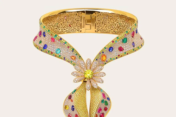 Jacob & Co.再为GD打造独一无二高级珠宝项链Bandana Royale,以他招牌的头巾为设计灵感,转化为一件充满雕塑感的项链,整件作品以18K金打造,采用全面密镶设计展现层次感,中央点缀GD标志性少一片花瓣的雏菊,主石为5.40 克拉的圆形明亮式切割艳彩黄钻。作品共镶嵌总重约209.71克拉的白钻、黄钻、祖母绿、红宝石、蓝宝石、尖晶石、沙弗莱石与帕拉伊巴碧玺,缤纷配色完美呼应他的穿搭风格。