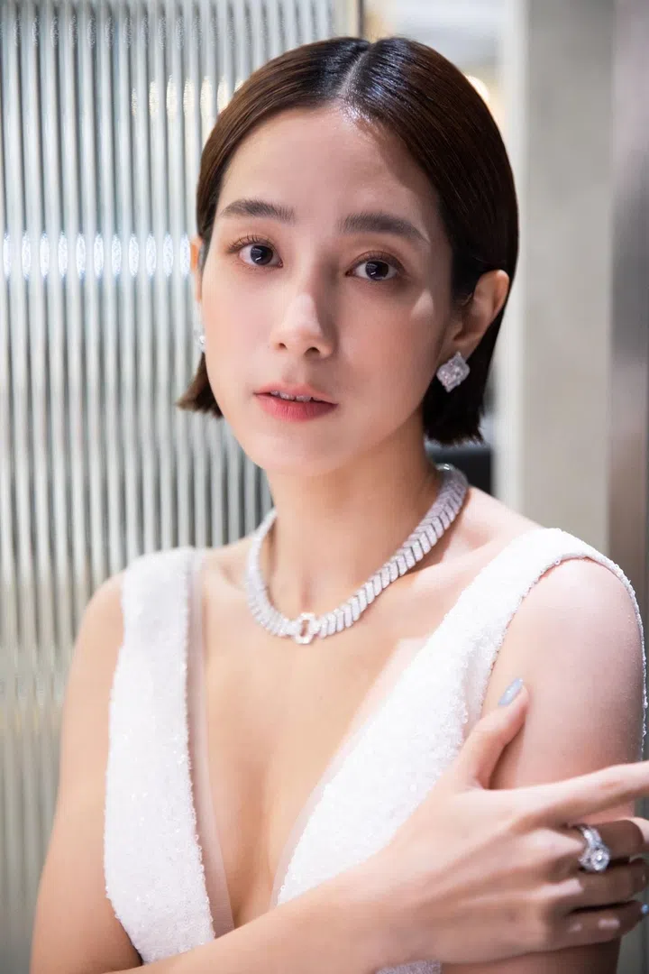 以《不想一个人》入围最佳女配角的温贞菱,身穿LinLi Boutique订制义大利象牙白亮纹钻光礼服搭配宝诗龙(Boucheron)高级珠宝Vendome系列钻石项链以及高级珠宝Yaroslov系列钻石耳环,腰间小露性感,让人眼睛为之一亮。