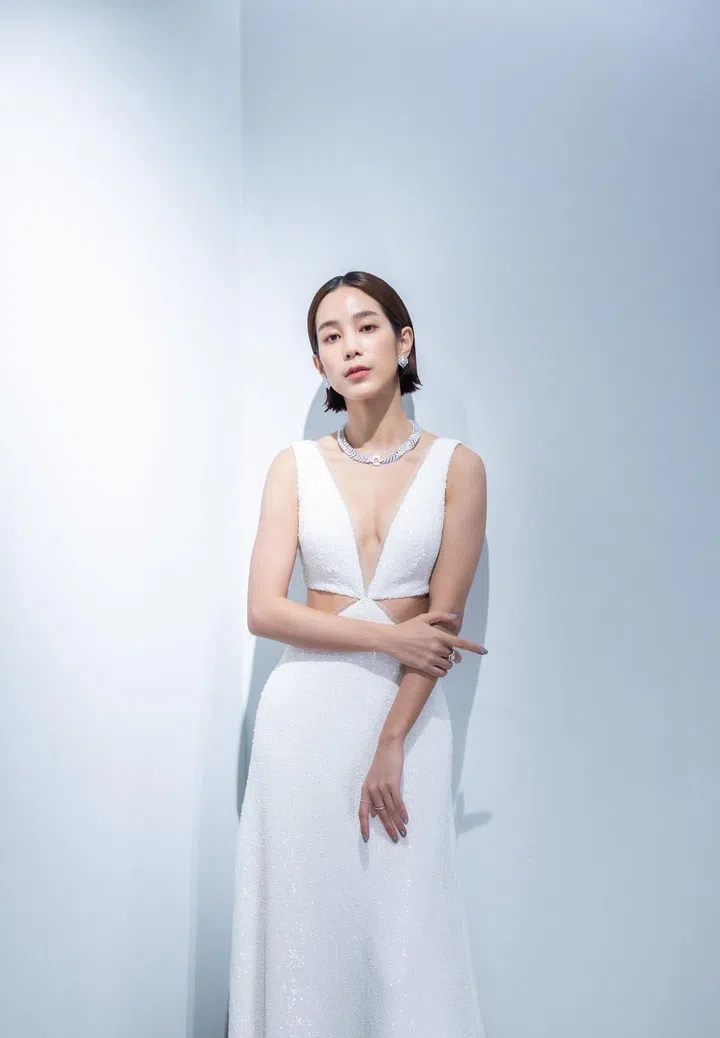 以电影《瀑布》入围最佳女主角的王净,踏上红毯时选戴尚美巴黎(Chaumet)经典Joséphine Aigrette系列18K白金镶嵌明亮式切割钻石和Akoya珍珠耳环、Joséphine Aigrette 18K白金镶嵌明亮式切割钻石和Akoya珍珠手链,