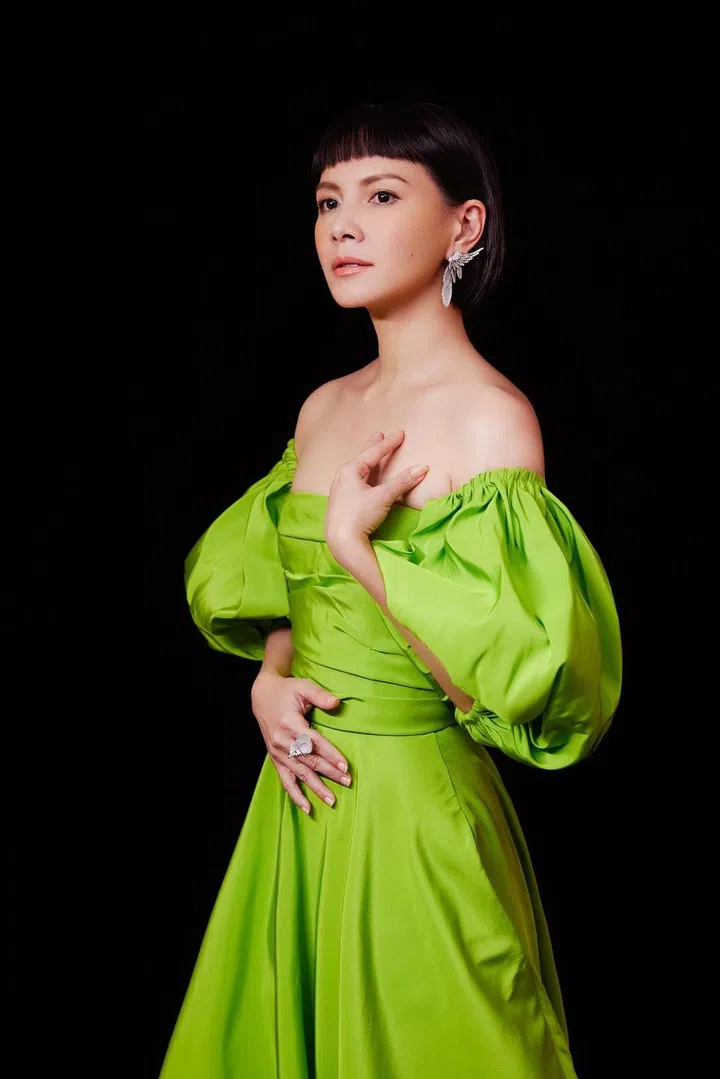 颁奖典礼上,陈庭妮又换上另一套绿色洋装,同样搭配卡地亚(Cartier)Reflection de Cartier系列白金镶钻耳环、Pluiede Cartier白金镶钻手镯以及Reflection de Cartier白金钻石戒指。