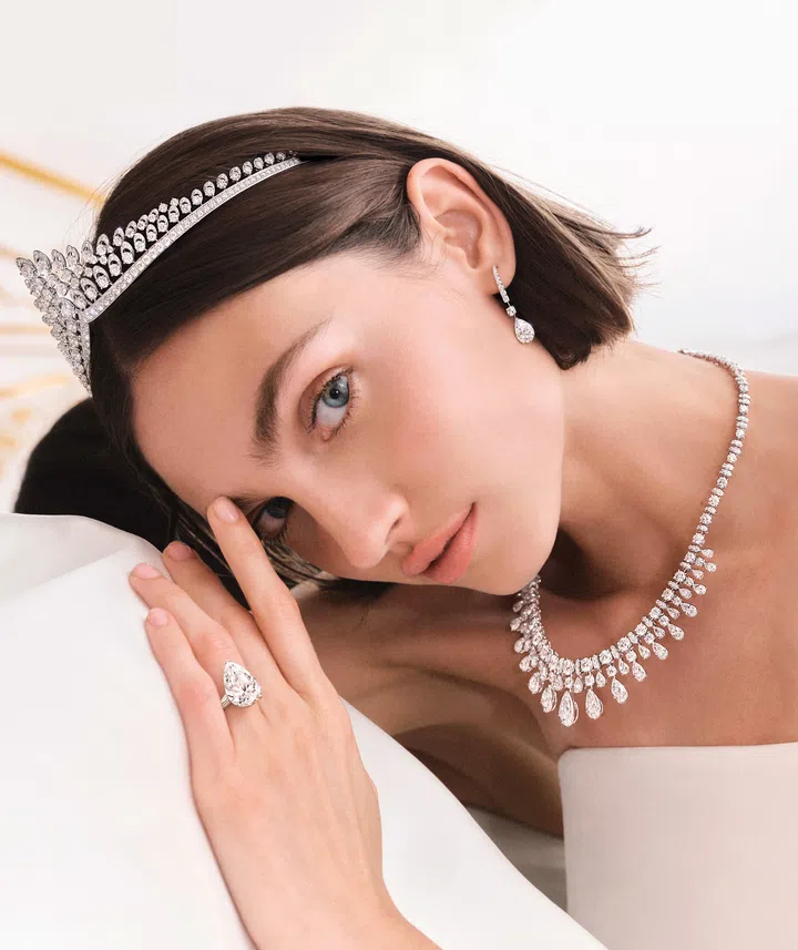 另一幅广告大片则凸显一枚共镶嵌逾30克拉圆形钻石的非凡白钻后冠,镶嵌共重逾40克拉梨形和圆形钻石的高级珠宝项链与9克拉梨形钻石Promise镶嵌订婚戒指优雅映衬,超然脱俗。