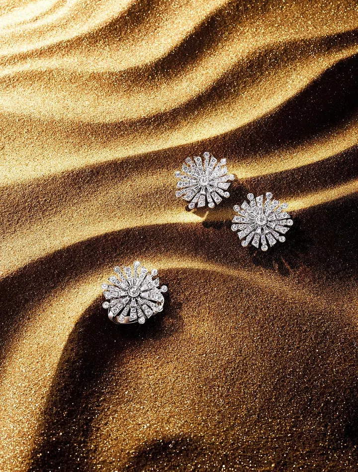 传说在远古沙漠的深处,一名神秘的女孩围着篝火起舞,她捞起余烬撒向空中,幻变成无数繁星照亮夜空,犹如钻石在空中闪烁着。这个奇幻又象征大自然与人类连结的美丽故事意象,成为格拉夫(Graff)最新的创作灵感,将钻石比拟为满天星斗,或是旭日明月,强调原始力量且富有张力的对称线条设计,成就格拉夫2021年Tribal高级珠宝系列独特的设计符号,分为Graff Gateway、New Dawn和Night Moon设计,谱写成三个别具深意的篇章。