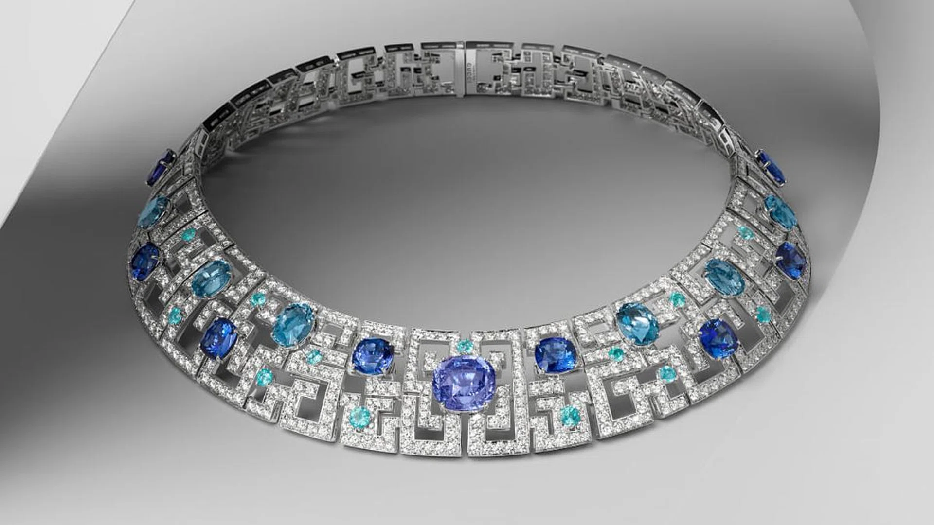 盛放的大自然中少不了飞禽走兽,轻巧体积但却能高速飞行的蜻蜓便成为一款胸针、一对耳环的形式,展现线条与不规则的有机感。一枚使用海水蓝宝为主石的戒指,以极富份量感的尺寸,体现义式珠宝对宝石的追求;不容错过的则有一条高级珠宝项链,大胆地镶嵌以53.25克拉湖水绿碧玺、19.68克拉衣索比亚蛋白石,其结构的几何感是源自摩尔人在欧洲留下的文化遗产,更以鲜艳的宝石色彩对比,勾勒出对生活的热情,令人咏叹再三。