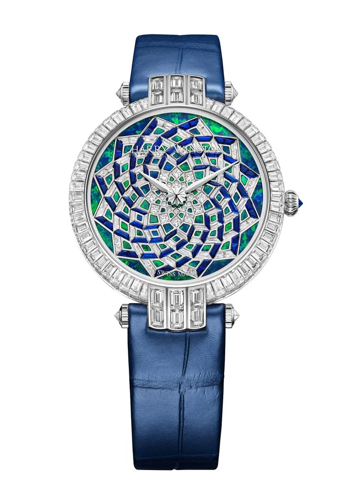 海瑞温斯顿(Harry Winston)全新卓时Premier系列Hypnotic Opal Mosaic 36毫米自动腕表精致迷人,完美诠释了海瑞温斯顿先生(Mr. Harry Winston)对高级珠宝的动感魅力和绚丽色彩的热爱。腕表采用奢华的白18K金精心打造,璀璨夺目的长形切工钻石和亮丽的艳彩蓝宝石旋转排列于底部散发虹彩光芒的蛋白石之上,色彩和动感向四面八方发散,展现优雅迷人的风采。
