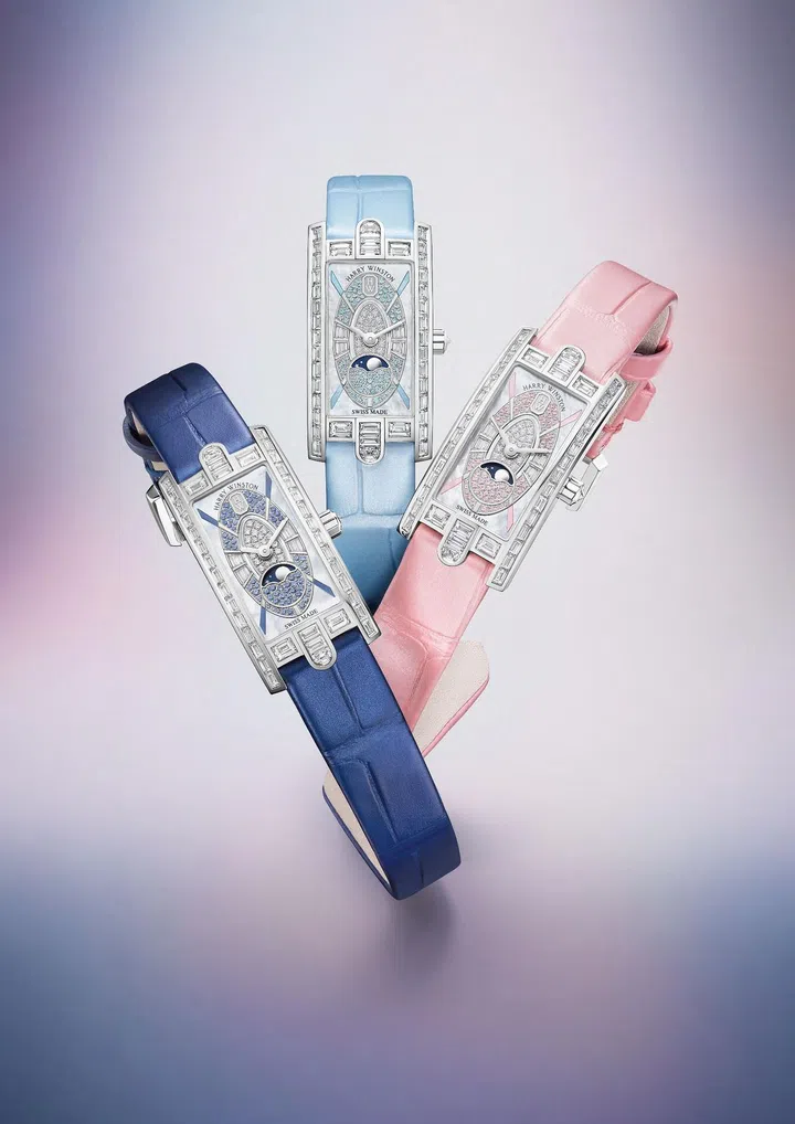 海瑞温斯顿(Harry Winston)还推出了三款全新第五大道Avenue C™系列迷你月相功能20周年纪念款腕表,表壳四周镶嵌有长阶梯形切工钻石,独具特色的表盘上镶嵌着不同切割工艺的宝石,色泽绚丽,散发动人光彩。极富女性气质的设计中融入了充满诗意的月相功能,精致柔美,别具一格。
