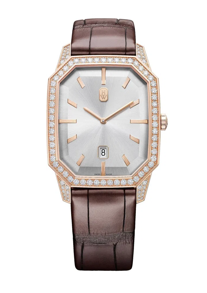全新款大尺寸海瑞温斯顿(Harry Winston)印记Emerald系列腕表。该款腕表搭载自动机械机芯或石英机芯,现代时尚又不失经典,散发高贵优雅气质。别具一格的祖母绿形表壳造型及与众不同的表盘重现了海瑞温斯顿先生钟爱的优雅祖母绿形钻石切割。