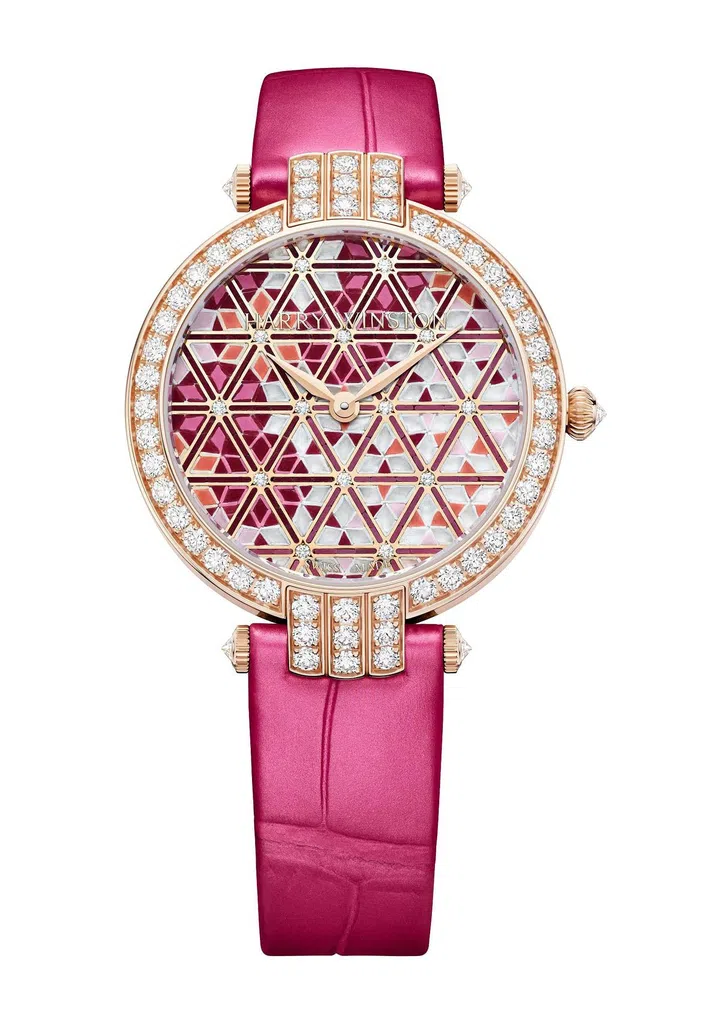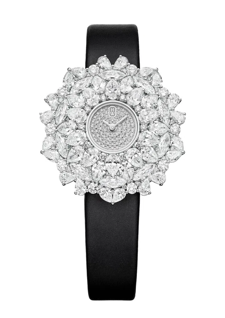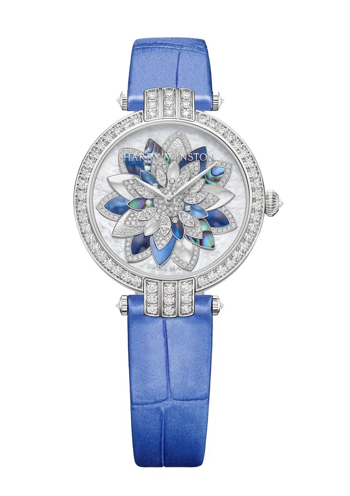 海瑞温斯顿(Harry Winston)卓时Premier系列Lotus 31毫米自动腕表的金制表盘上,惟妙惟肖的莲花造型从珍珠般的水波中呼之欲出。清丽脱俗的花瓣层层绽放,闪烁着不同的色彩与光泽,如同品牌珠宝作品般呈现唯美的立体层次感,让人不禁联想起海瑞温斯顿近百年的辉煌历史。精致华美的花朵盛放在白18k金或玫瑰金质的表盘之上,表款搭载着繁复精巧的机械机芯,任凭时光流转,依旧准确地走过花样年华中的分分秒秒。