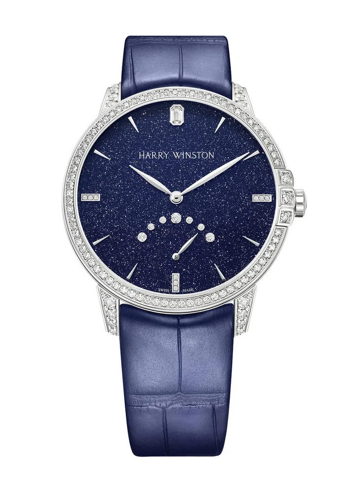 全新推出的静夜Midnight ™系列逆跳秒针39 毫米自动腕表以现代设计风格诠释经典表款,蓝色砂金石和钻石精巧镶嵌,如同闪烁星空,熠熠生辉。表盘采用复古而柔美的设计,搭配精密的逆跳秒针功能,令人联想起海瑞温斯顿(Harry Winston)极具历史意义的皇冠设计。这款腕表搭载高端瑞士自动机械机芯,适合日常佩戴,亦可确保长久的精准性能。