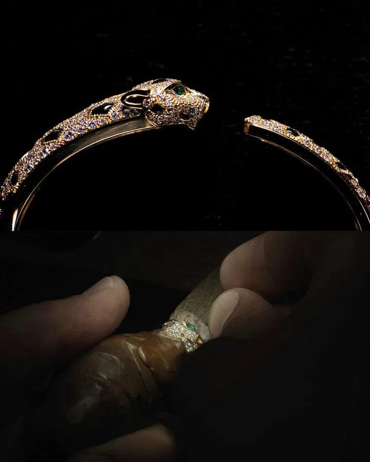 猎豹是卡地亚(Cartier)珠宝中标志性的动物元素,猎豹的神情姿态,被珠宝大师捕捉得十分到位。然而想要制作一件猎豹珠宝,工艺步骤十分复杂,非常考验工匠的技艺与耐心。为了尽可能逼真地体现造型细节,设计师先将设计草图以软蜡或硬蜡雕磨成型,可具体显现容积。而后在模型上挖出宝石镶嵌所需的洞孔,再以模型测试宝石的摆放, 获得最佳的镶嵌位置,同时将模型上色,以感受宝石排列发出的色泽感。
