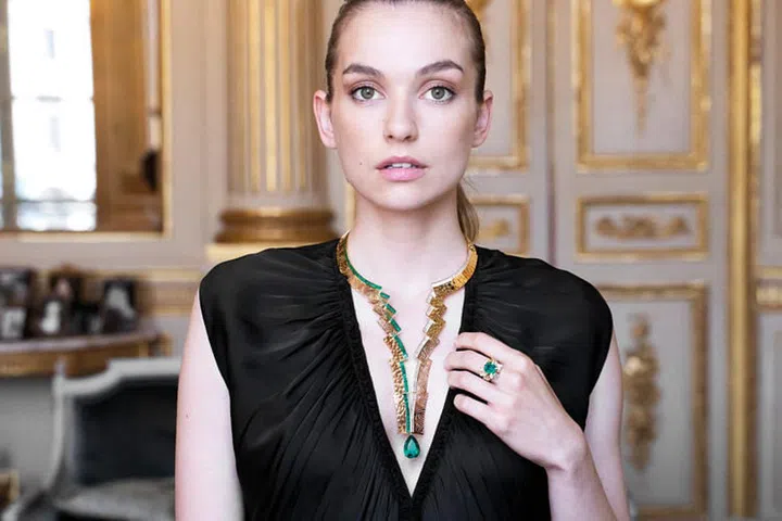 “天际探寻”(Skyline)篇章作品,则延续了世家对纹理特征的探索,每个黄金面都经过镂空、雕刻、锤击、抛光,展现独特纹理的同时也更加轻盈,贯彻尚美巴黎精于细节的传统。其中,镶嵌于瀑布式项链上的一颗重达16克拉的哥伦比亚梨形祖母绿,色泽艳丽,拥有天鹅绒般的质感,搭配黄金温暖的光晕,活泼灵动。