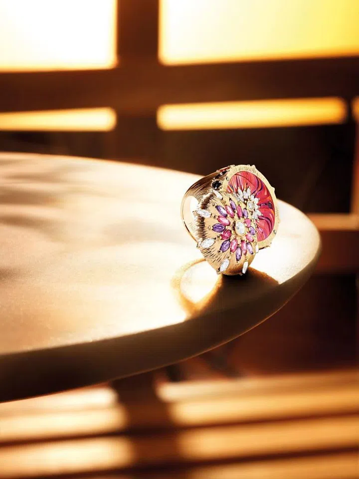 伯爵Sunlight Journey系列Viva l’Arte 戒指,18K玫瑰金镶饰红色尖晶石、紫色蓝宝石与钻石。