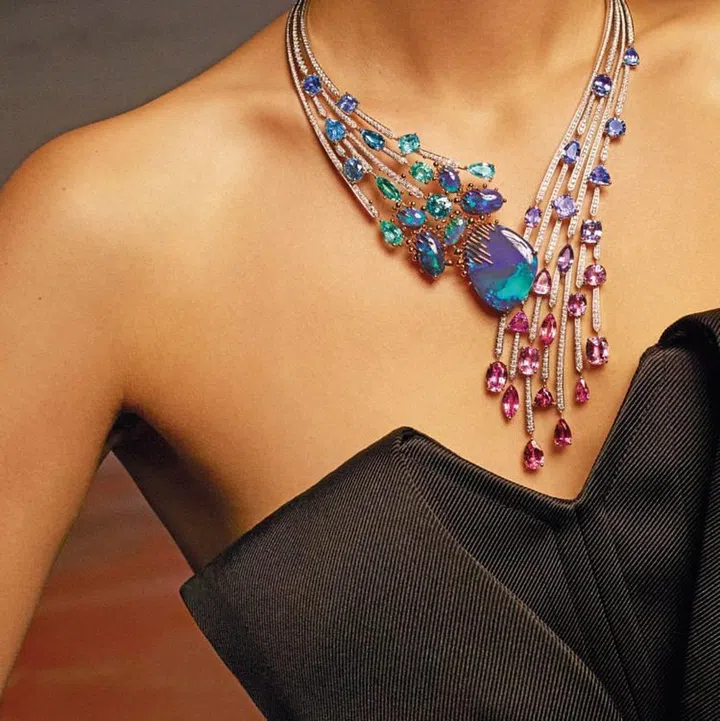 以“天空宇宙”为主题的尚美巴黎(Chaumet)Les Ciels de Chaumet高级珠宝,灵感来源相当广泛,如特纳、梵高的风景画、日本浮世绘、法国诗人Gerald de Nerval和Stephane Mallarme的诗作。设计师以瑰丽的彩色宝石重新演绎云彩、日月、星辰、飞鸟等主题,展现人类对天空的诗意想象。系列中的Passages白金和玫瑰金项链镶嵌6颗极为珍贵,来自澳大利亚的黑欧泊。只有澳大利亚的闪电山麓出产黑欧泊,而且是最为稀有的欧泊。19世纪,巴黎的女性喜爱各种各样的欧泊。而黑欧泊直到20世纪初期才被世人发现,很快成为“欧泊之王”。作品展现宇宙之夜的神秘,缤纷的色彩令人想起彗星在天空一扫而过的美丽瞬间。
