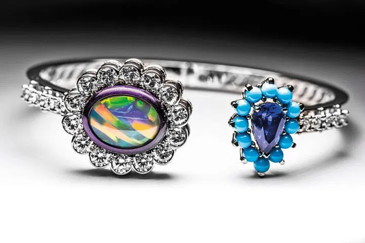 同样彰显宝石本身力量的手法,也出现在以澳洲脉石欧泊石为主石的Zemia系列珠宝。辨识度极高的澳洲脉石欧泊石的特色在于,欧泊特色的游彩会在咖啡色的铁矿石背景上闪烁光芒。Zemia手镯所镶嵌的77.27克拉主石凝聚着象征岩石的褐色、蓝色的湖泊、及紫罗兰色的斑纹,彷佛由上而下俯瞰地球形成之初的绝美景致,因此周围特别配衬紫罗兰色的刚玉凸显其特色。同系列戒指上的8.95克拉的澳洲脉石欧泊石,游彩则呈现绿色与橘色的细致差异,因此搭配橙色锰铝榴石和蓝宝石。