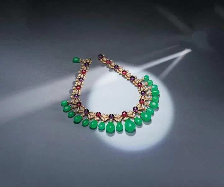 宝格丽Cinemagia系列Charming Sirens项链,18K黄金镶嵌绿玉髓、紫水晶、纷色红碧玺、钻石与密镶钻。