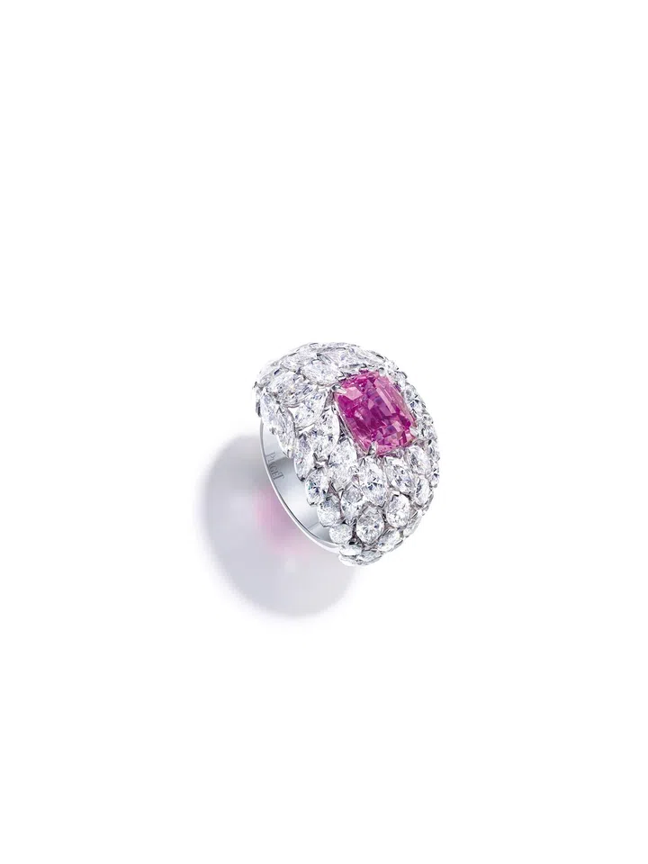 Summer Side of Life戒指:18K白金,镶饰1颗来自锡兰的枕形切割无烧粉色蓝宝石(约重4.09克拉)及58颗马眼形切割美钻 (约重6.73克拉)