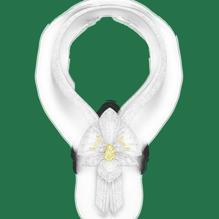 Lily Radiant项链,一颗20.08克拉的梨形切割黄钻置于中心,219.06克拉的水晶与钻石镶嵌于周围作为花瓣,百合花可拆下作为胸针佩戴。