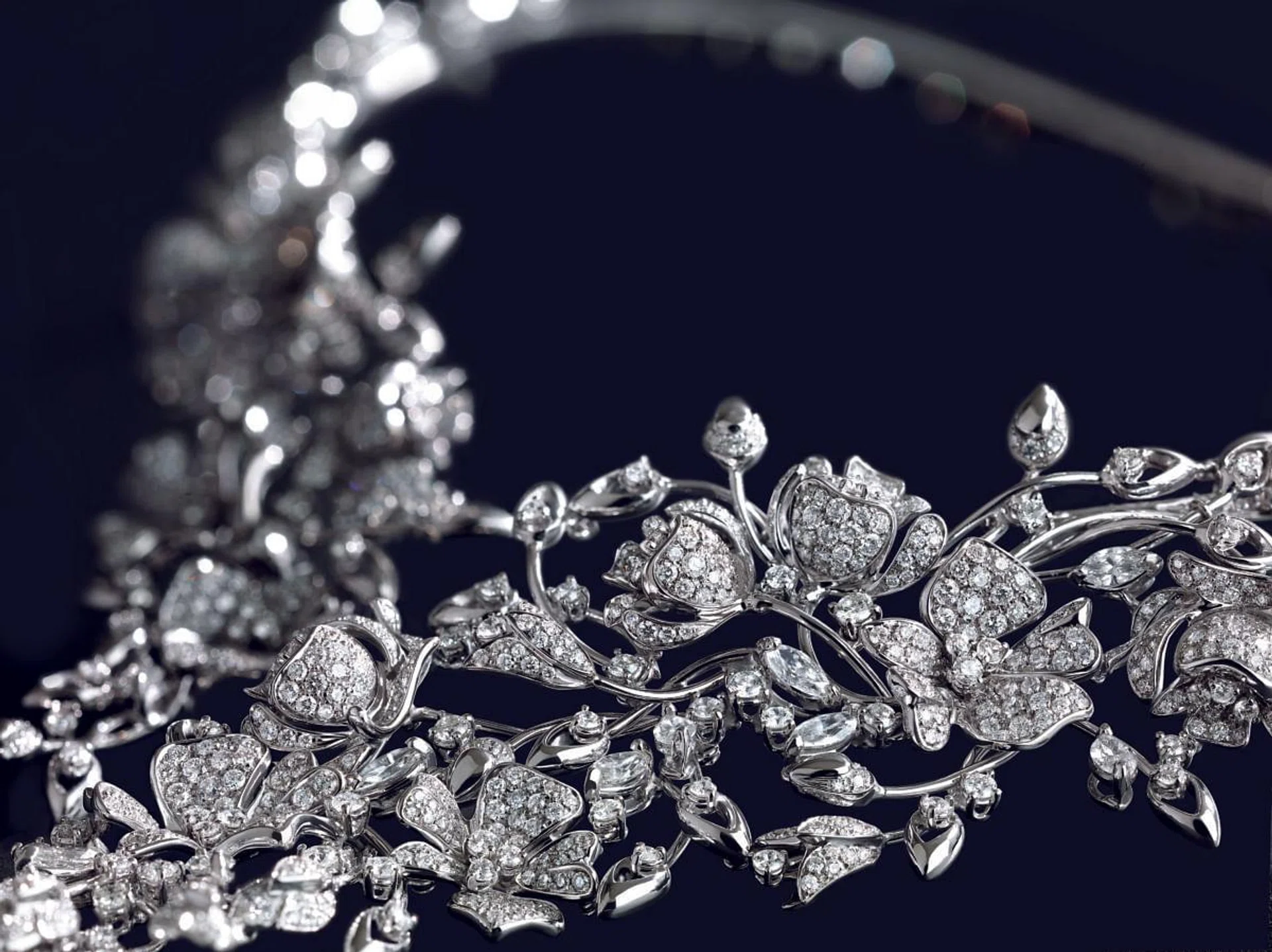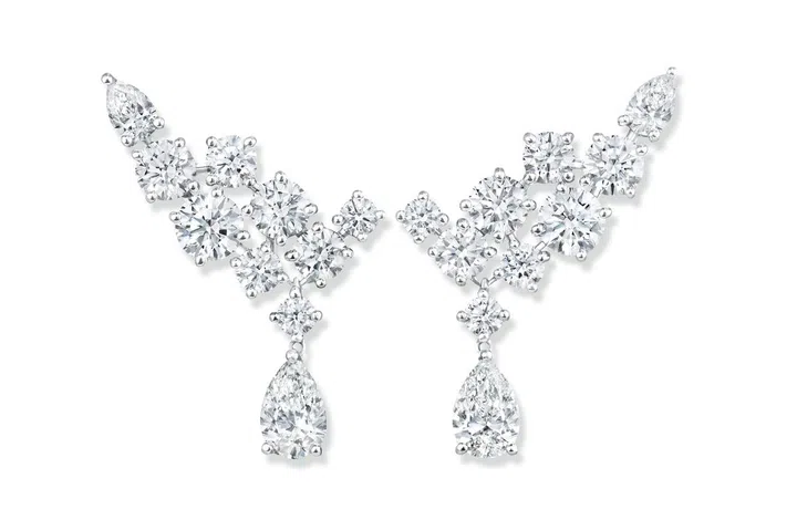 Harry Winston的绚漪錦簇Sparkling Cluster珠宝系列,其设计灵感来源于品牌在上世纪四十年代所推出的“Winston Cluster”和“Lotus Cluster”珠宝,仅通过圆形切割和水滴形钻石勾勒出行云流水般的锦簇图案,除了镶爪外看不到任何金属,钻石仿佛温柔地亲吻着肌肤,在新娘幸福的笑容下绽放无尽光华。满天的星辰散落人间,灿然灵动,熠熠生辉。