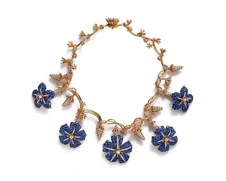 Masterpieces Jean Schlumberger Full Flower项链:18K黄金镶嵌钻石与蓝宝石