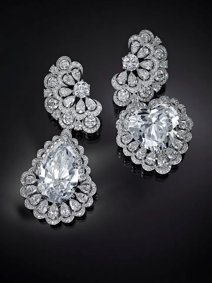 The Garden of Kalahari耳环:18K白“Fairmined”金镶嵌两颗D级无暇钻石——25克拉梨形和26克拉心形切割钻石,周围镶嵌总重为4.55克拉的梨形切割钻石与总重为4.35克拉的明亮式切割钻石。