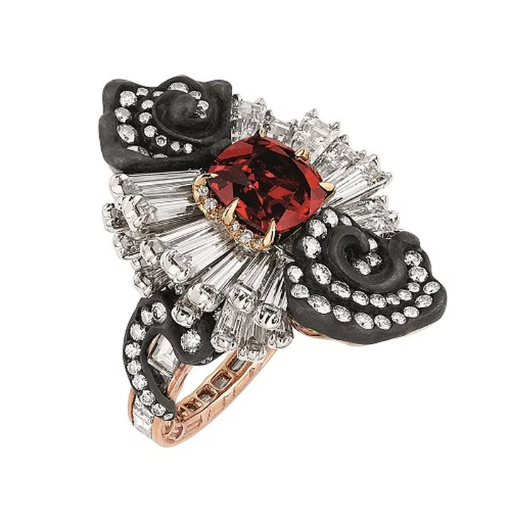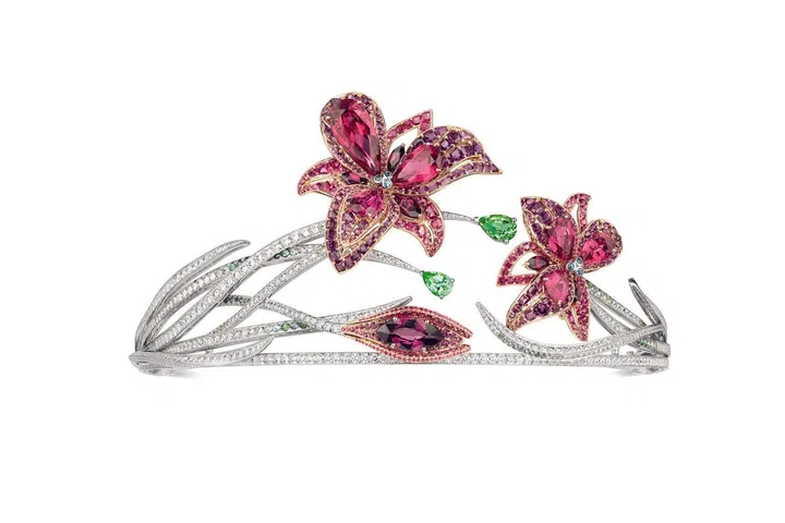 Passion incarnat可转换冠冕:白金与玫瑰金镶嵌着4颗坦桑尼亚梨型红色尖晶石,分别重达11.13,5.55,4.48,3.37,2.95和2.77克拉,1颗重达5.48克拉的榄尖形红榴石;2颗绿色梨形碧玺,分别重达2.37克拉和1.30克拉;圆形特别切割的碧玺绿;圆形红榴石和红色尖晶石和明亮式切割钻石。头饰的两大主题可以分离成两个胸针佩戴。 最大的图案可以作为红色尖晶石珠和碧玺绿色项链佩戴。