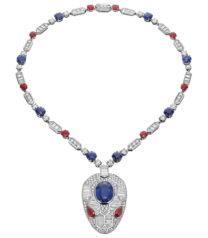 这次,宝格丽以璨耀地中海(The Magnificent Inspiration)为名,推出了三个主题的高级珠宝,分别为意式美学(Italian Extravaganza)、地中海伊甸园(Mediterranean Eden)和罗马传奇(Roman Heritage)。地中海伊甸园系列中有多件以蛇为造型的珠宝,其中又以珠宝设计总监Lucia Silvestri与腕表设计师Fabrizio Buonamassa Stigliani联手打造的Serpenti Seduttori最为瞩目。磁吸魔力的双眸生动捕捉了蛇眼迷幻的催眠魔力,让人深陷其中无法抗拒。白金打造的项链还原了蛇柔软的躯体,镶嵌的蓝宝石、红宝石与长棍形切割钻石蛇身体上的美丽花纹,头部镶嵌的大颗蓝宝石与品牌独特的六角形切割图案的鳞片互为呼应,生动还原了蛇的迷人姿态。