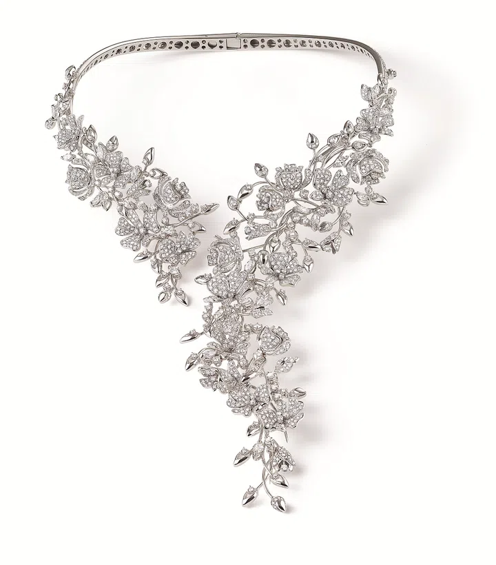 由一颗来自Botswana矿区的342克拉的完美圆钻打造而成的Garden of Kalahari闪耀着与众不同的夺目光芒。23颗钻石中有五颗重达20克拉以上,分别以枕形、明亮式、心形、祖母绿形、梨形的切割方式打造,萧邦的工匠师用其惊人的创造力与精湛的工艺将粗糙的石头变成精致璀璨的珍贵珠宝首饰。