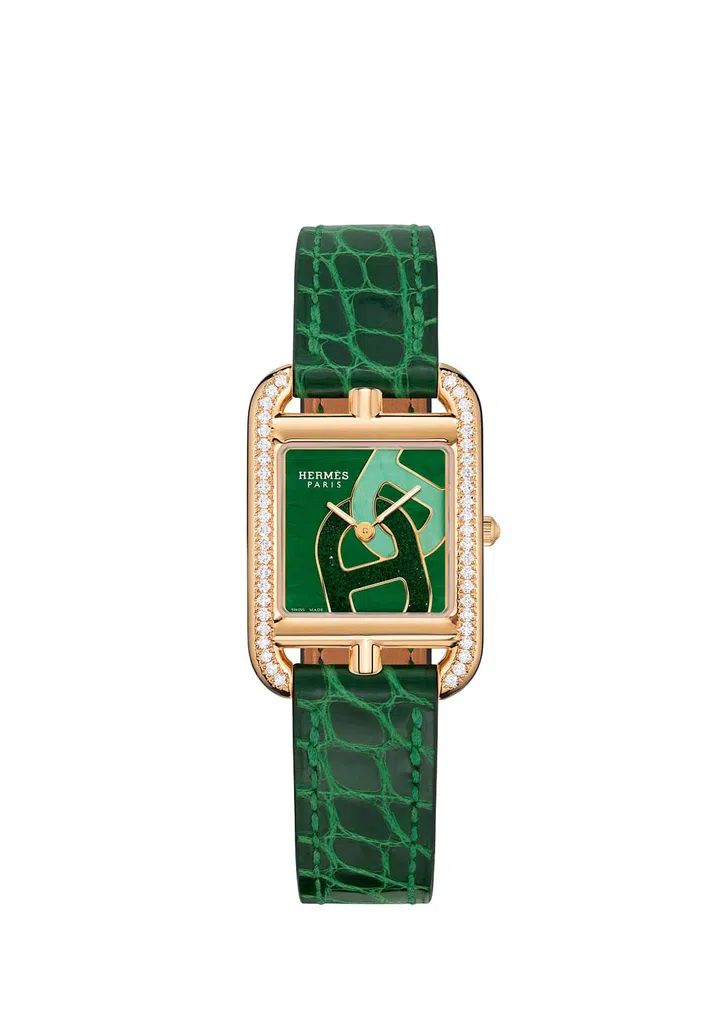 玉是中国传统文化的重要组成部分,是中华文化的载体,是中国五千年文明的传承。在中国人的眼中,玉不仅仅是一块石头,而是生长于天地之间,吸收天地之灵气,沉淀历史的沧桑变化,融天地与历史于一身的灵性之物,因此镶有玉的珠宝或腕表,一直都深受华人的喜爱。爱马仕新款Cape Cod Chaîne d'ancre腕表的表盘由软玉、绿玉髓和绿色东陵石打造而成,搭配绿色鳄鱼皮表带,独树一帜,个性十足。