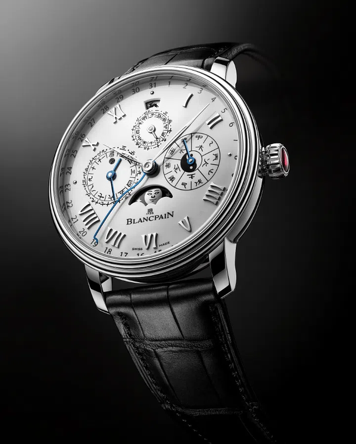 腕表采用温润的白色大明火珐琅表盘,镶嵌金质收腰罗马数字刻度,由造型优雅的镂空柳叶针指示;而以珐琅绘制的标准公历日期,则由经典蓝钢蛇形指针指示。时辰、星期、月份(包括闰月)、十二生肖、五行及天干等中华年历的重要信息同样采用珐琅绘制的形式呈现。月相显示这一在20世纪80年代初因宝珀而复兴、重返制表业界前沿的复杂功能,在这枚时计中亦有体现。月相不仅是品牌全历腕表的重要组成部分,亦与中华年历计时规则中每月的日期息息相关。