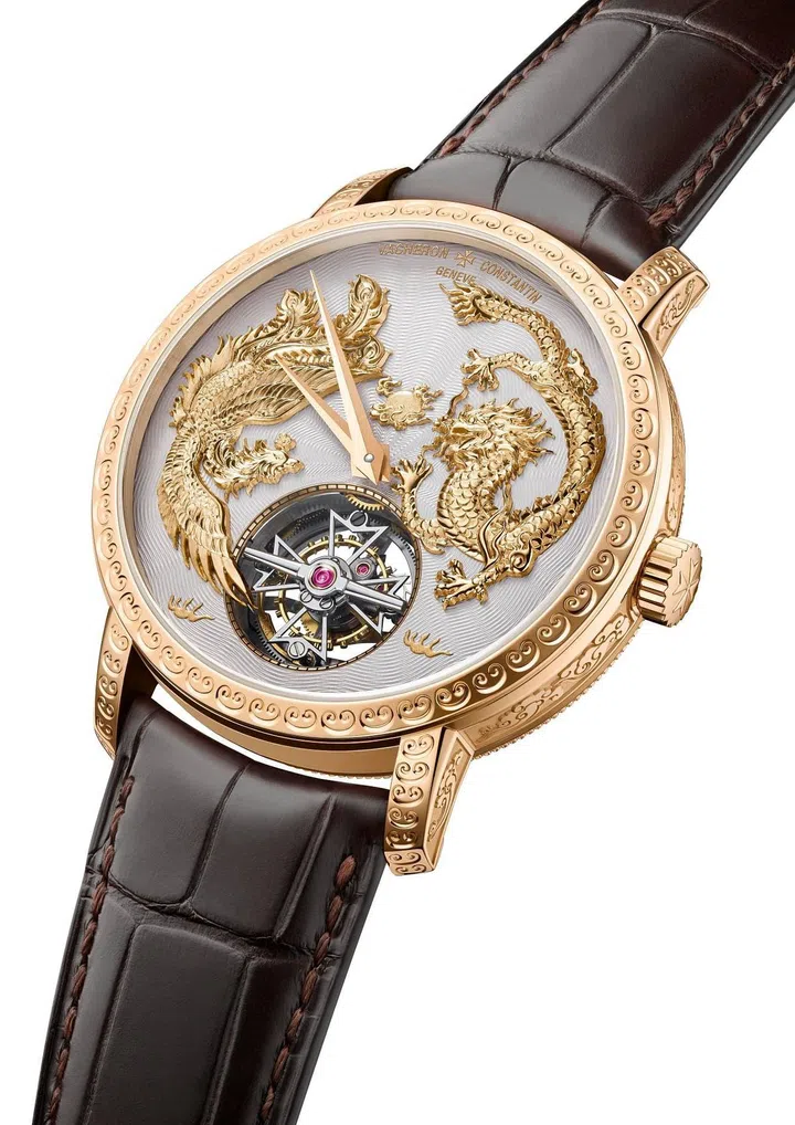 江诗丹顿(Vacheron Constantin)Traditionnelle传袭系列“升龙祥凤”陀飞轮限量款腕表于方寸表盘间生动演绎中国传统的龙凤戏珠图。精心雕饰的18K 5N粉红金表壳内,手工机刻雕花表盘上镶贴以精工雕刻而成的一对瑞兽形象,气韵非凡。三款全新腕表的手工机刻雕花表盘经由电镀工艺处理,分别呈现黑色、深蓝色和银色,为这一神话图景赋予层次分明的纵深感。