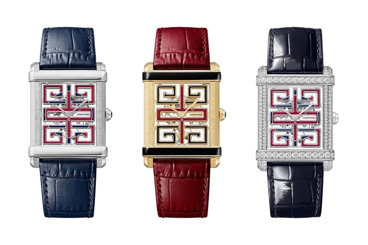 腕表搭载的9627 MC机芯再度融合镂空工艺露出手动上链机芯的立体构造,同时机芯在镂空后保留的支撑桥板别具意义,原来卡地亚是从中式传统窗櫺获取缪思,其对称造型让人想起“回纹锦”图案,这种图案寓意福寿吉祥,且线条彼此相近却又找不到交合点的设计也带有无限美好之意。卡地亚分别在机芯的镂空桥板上施以红/黑色真漆(黄金款)与蓝/红色真漆(铂金款),营造出更华美且生动的视觉感受,细看面盘的桥板经过不同颜色真漆的勾勒后,隐隐现出一个埋藏在腕表的“中”字,具体而微地将Tank Chinoise的设计概念细腻诠释至系列史上首见的新高度。