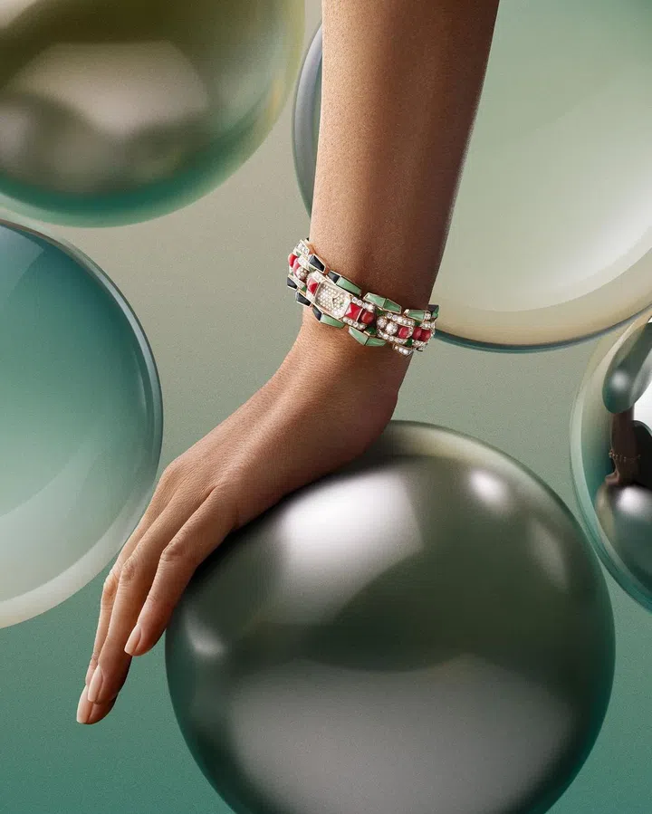 与中华文化拥有深厚渊源的这个天然有机宝石,常出现在卡地亚(Cartier)珠宝作品中,而近期全新推出的Clash [Un]limited腕表,其中一款便利用珊瑚、黑色尖晶石、绿玉髓、沙弗莱石和钻石等彩色宝石的鲜明色彩对比,突显几何图案。在黄K金或玫瑰金等金质作品上,卡地亚交替运用磨砂和缎面处理质感,再以品牌独立研发全新色调的“紫金”铸造成巴黎饰钉或表炼的圆珠,波纹粼粼的淡紫色泽,为整体设计画龙点睛。