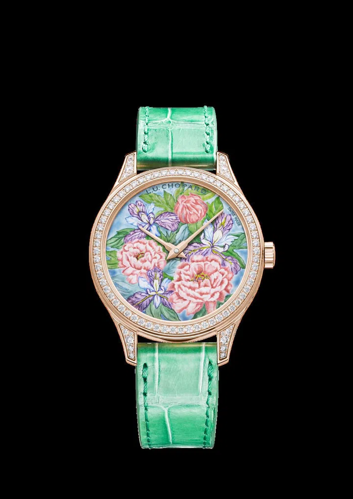 腕表以符合伦理道德标准的玫瑰色18K金制成,淋漓展现了其工坊中最为精美的工艺之一:大明火珐琅。萧邦珐琅工匠从位于弗勒里耶的萧邦博物(L.U.CEUM)展出的装饰精美的怀表汲取灵感,借鉴其美学风格,设计出一款洋溢着盎然生机的表盘,表盘上的粉色牡丹在浅绿色背景下恣意绽放。L.U.C 96.23-L自动上链机械机芯通过透明表底盖清晰可见,同时还饰有精美的Fleurisanne雕刻图案。
