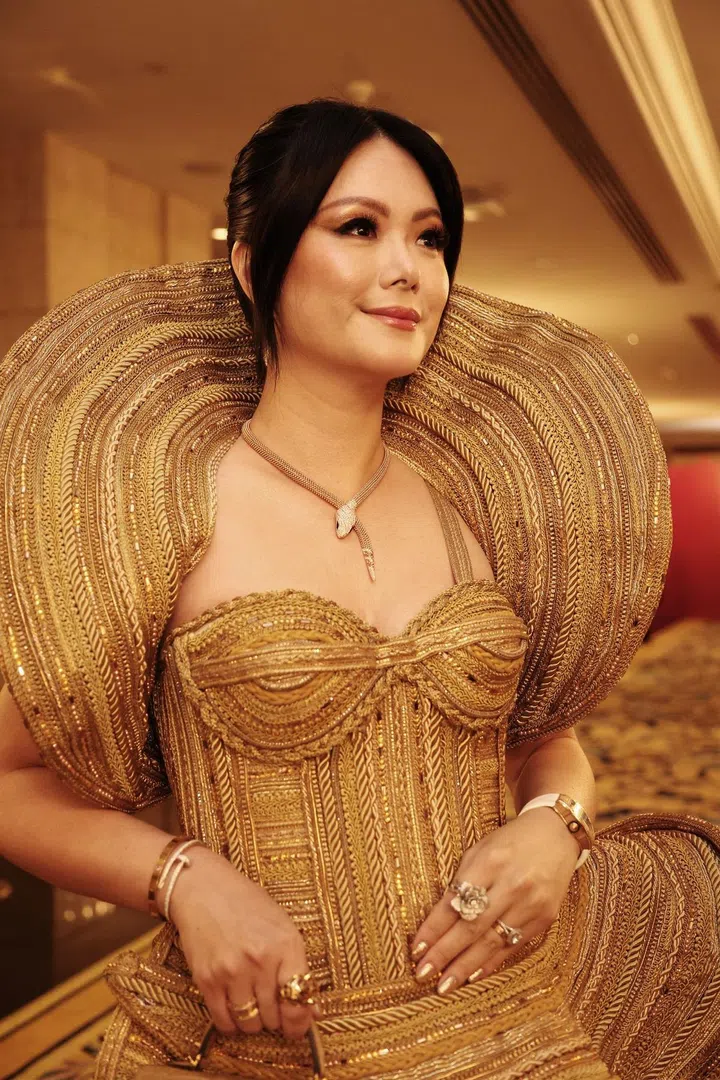 Chermaine Pang以宝格丽(Bulgari)最标志性的Serpenti高级珠宝系列项链,致敬女性坚毅果敢,尽显女王风范。她还以其他首饰包括来自卡地亚的戒指、卡地亚LOVE及Juste un Clou系列手镯、DeFRED的玫瑰花造型戒指等加以点缀。