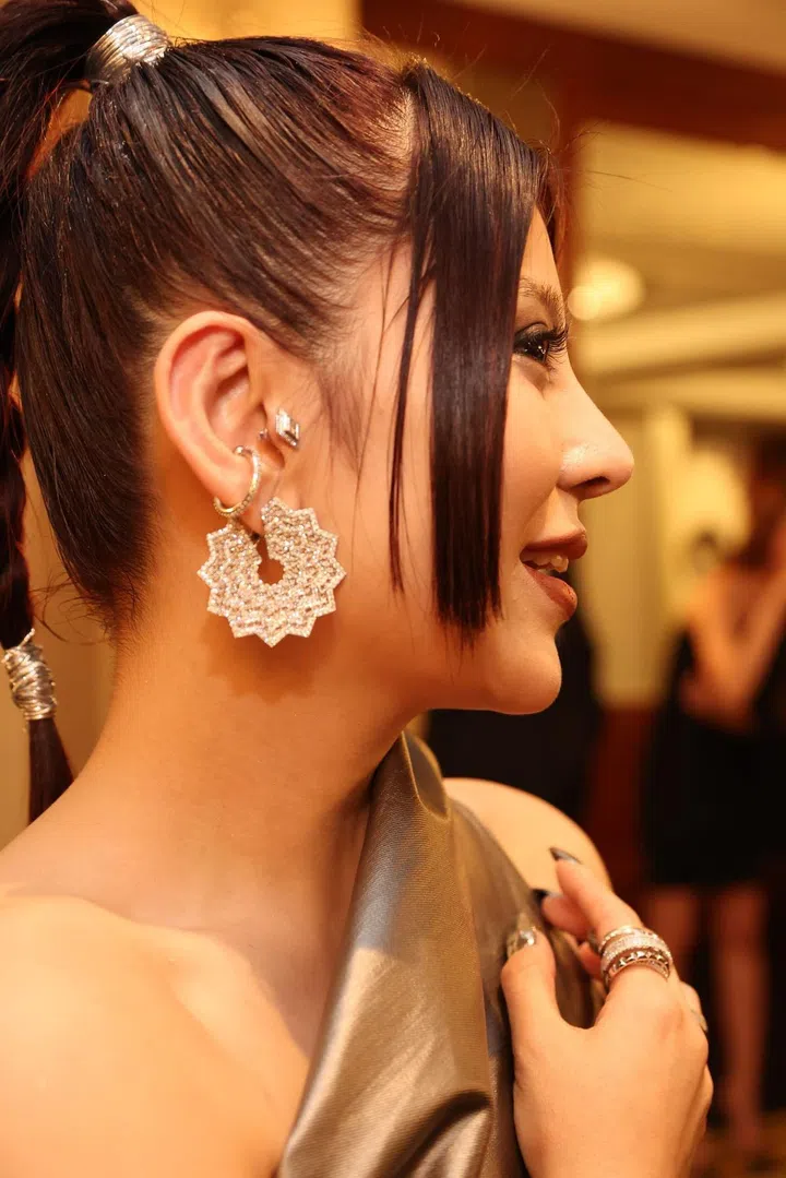 Sabrina Ho玩转珠宝搭配,展现自由随性的态度,其中最耀眼的是出自自家品牌Flower Diamond的白金钻石耳环,作品镶嵌430颗圆钻(总重6.03克拉)和198颗玫瑰形切割钻石(总重5.36克拉)。