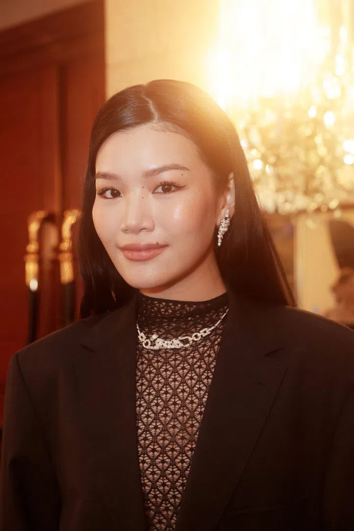 Adeline Teo的珠宝配搭以动物为主题,她选择的是卡地亚(Cartier)Les Oiseaux Libérés系列耳饰以及猎豹系列项链,灵感可爱的小动物造型与她甜美的气质相称。