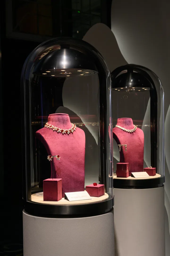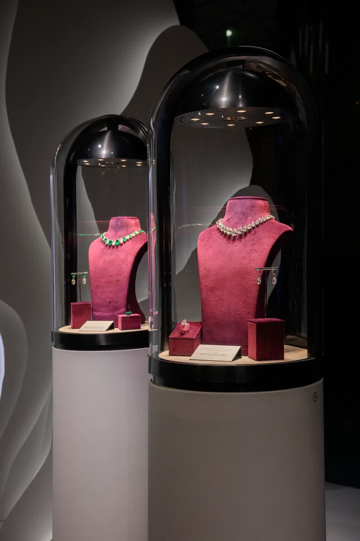 除了经典系列珠宝,品牌也推出高级珠宝系列,将培育钻石及祖母绿等培育彩色宝石融入设计中,通过精湛切割工艺凸显颗宝石的品质。以现场展出的一款“翡翠之道”(Emerald Passage)高级珠宝套组为例,主项链采用令人惊艳的实验室培育绿色祖母绿和钻石,透过层层递进的设计,构建出非凡气势。共重106.19克拉的实验室培育祖母绿,以一颗10.71克拉的梨形实验室培育钻石为视觉焦点,熠熠生辉。