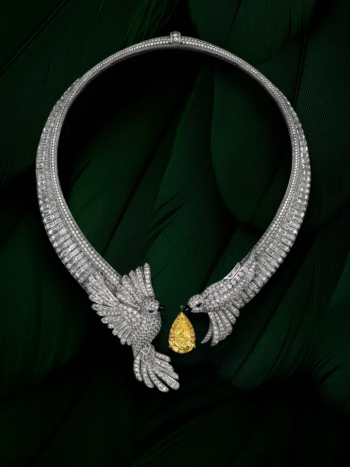格拉夫(Graff)“The Gift of Love”高级珠宝项链的轮廓立体自然,精致羽毛钻光闪烁,其俐落弧线由多颗特别切割的梯形钻石镶嵌而成,末端添上两只灵巧的钻石雀鸟,以欢欣画面颂扬自然之美。项链两端的雀鸟皆镶嵌蓝宝石眼睛和黑色缟玛瑙鸟喙,令人眼前一亮。其中一只雀鸟优雅地停驻于项链上,向另一只于空中飞舞的雀鸟送上一颗重达13.51克拉的梨形浓彩黄钻,将代表忠诚和爱慕的稀世美钻,变成无比珍贵的真爱之礼。项链共镶嵌2,247颗梨形、圆形和梯形切割钻石于巧妙连接的18K白金镶托上,每一颗钻石的切割和打磨皆经手自格拉夫的资深工匠,力求展现其无瑕光芒。