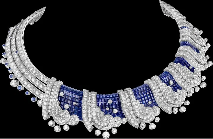 梵克雅宝(Van Cleef & Arpels)Treasure Island高级珠宝系列Écume Mystérieuse 项链的设计致敬了19世纪风靡一时的航海主题画作,罗伯特•路易 斯•史蒂文森的《金银岛》亦创作于那个时代。Écume Mystérieuse项链撷取同类作品的风格,透过汹涌的波涛刻画汪洋的力量。 不对称的造型与排列有致的构图形成对比,白K金划出重叠交错的线条,与钻石一同勾勒出一朵又一朵的浪花,在一泓Traditional Mystery Set传统隐密式镶嵌打造的蓝宝石海面上激起汹涌的浪尖,伴随着点点飞珠溅玉回归平静,幻化成由圆钻和蓝宝石堆叠而成的晶莹泡沫。