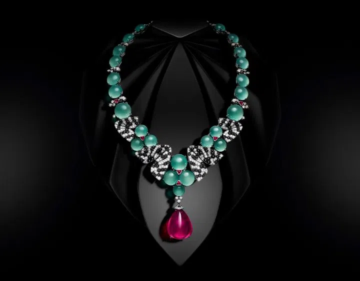 蝴蝶是卡地亚(Cartier)最为钟爱的昆虫之一。在Chryseis项链中,品牌通过翅膀上的缟玛瑙斑纹图案,唤起人们的对蝴蝶的无限遐想。缟玛瑙、钻石与玉髓圆珠交相辉映,呈现富有活力、生机盎然的色调,为品牌标志性“红、绿、黑”配色注入新的活力。一颗63.76克拉红碧玺吊坠色泽浓郁绚丽,营造出和谐迷人的美感。
