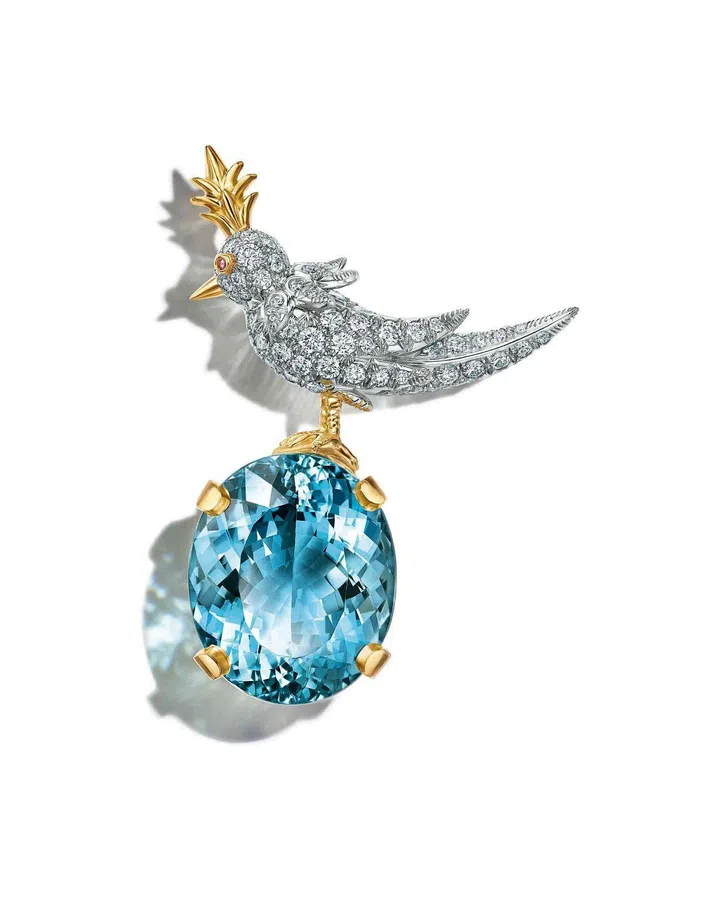 Schlumberger高级珠宝系列石上鸟Bird on a Rock胸针,铂金和18K黄金镶嵌椭圆形海蓝宝石和圆形明亮式切割钻石/Tiffany & Co.。