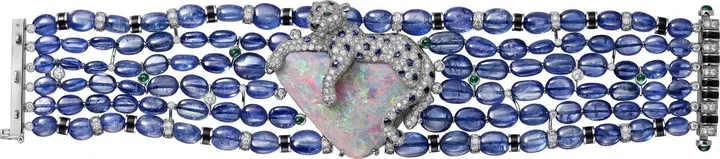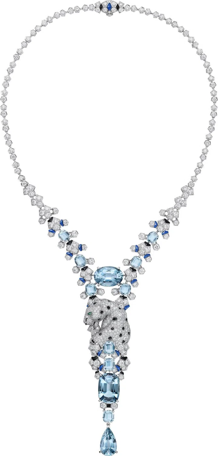 Panthère Givrée高级珠宝项链,白金镶嵌海蓝宝石、青金石、缟玛瑙、祖母绿和钻石/Cartier。