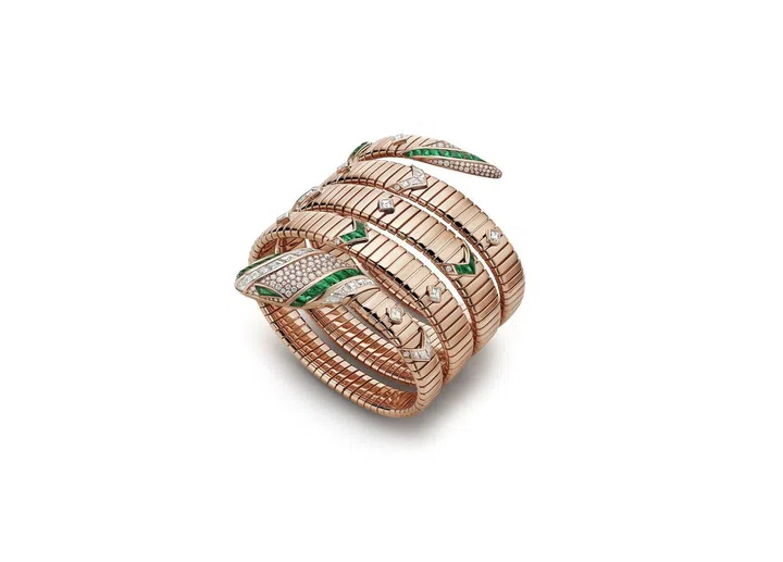 Serpenti系列于1948年以装点于腕间的珠宝腕表问世,结合标志性的Tubogas工艺,演绎柔韧、风格化的造型设计。至50年代,Bulgari宝格丽灵蛇元素开始采用更为具象的风格,并在60年代达到巅峰,成为了艺术创造的实验画布,运用宝石和彩色珐琅加以演绎。在不同的表现形式间迭代演变,Serpenti系列大胆呈现令人惊叹的六边形鳞片图案,以多种珍贵材质打造,巧妙结合精美宝石、迷人设计和创意工艺。自Serpenti系列问世以来,灵蛇意象在罗马珠宝品牌的创造力淬炼下不断蜕变革新,以变幻莫测的造型与设计,展现多面魅力。精美动人,历久弥新——这一元素成为无尽更迭与迷人蜕变的象征,为女性平添真我魅力,在每一个高光时刻恣意展现千面风姿。