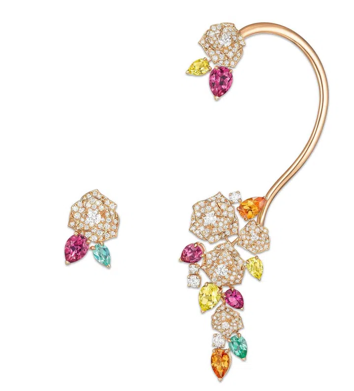 Piaget Rose耳骨夹,玫瑰金镶嵌橙色锰铝榴石、黄色绿柱石、蓝绿色帕拉伊巴碧玺、粉红色碧玺和钻石/Piaget。