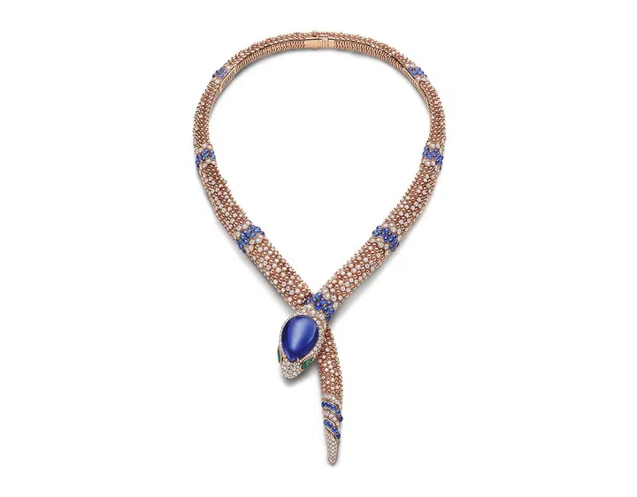 Serpenti高级珠宝项链,玫瑰金镶嵌梨形凸面形切割蓝宝石、祖母绿、圆形凸面形切割蓝宝石,饰以密镶钻/Bulgari。
