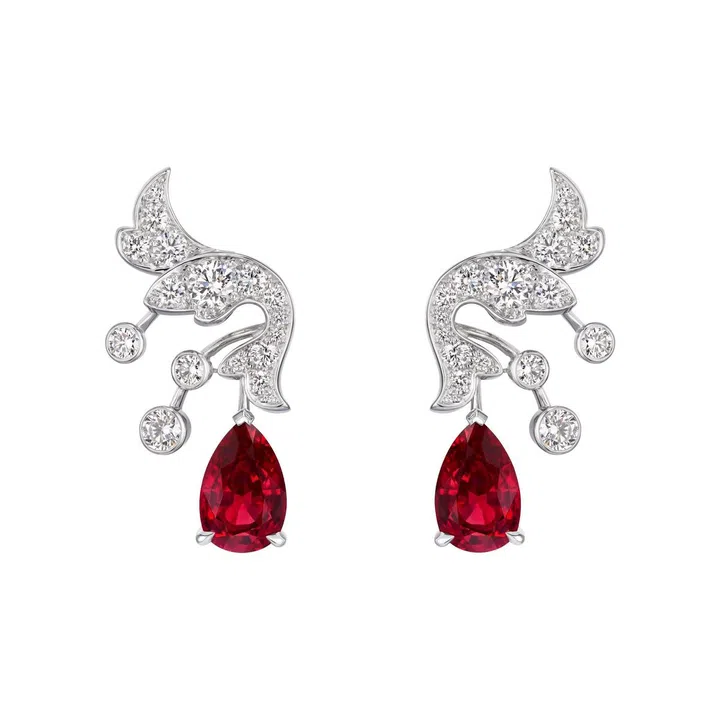 Soir de Fete耳环,白金镶嵌梨形红宝石和明亮式切割钻石/Chaumet。