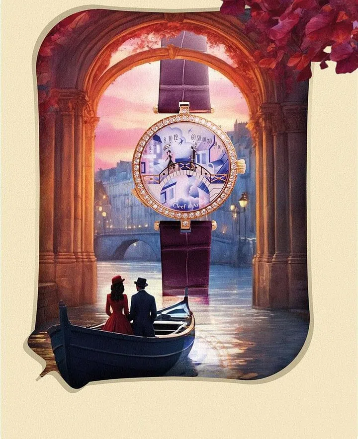 爱情是梵克雅宝(Van Cleef & Arpels)自诞生以来的灵感源泉,2010年,被称为“情人桥”的Lady Arpels Pontdes Amoureux腕表首次推出,以浪漫爱情故事演绎经典的逆跳显示机械机芯,从此成为世家的经典印记。彼此魂牵梦萦的恋人,于巴黎的桥上相遇。在逆跳机芯的帮助下,分别代表小时和分钟的爱侣一点一点靠近,每逢正午和午夜,深情拥吻,倾诉着对于彼此的思念之情。