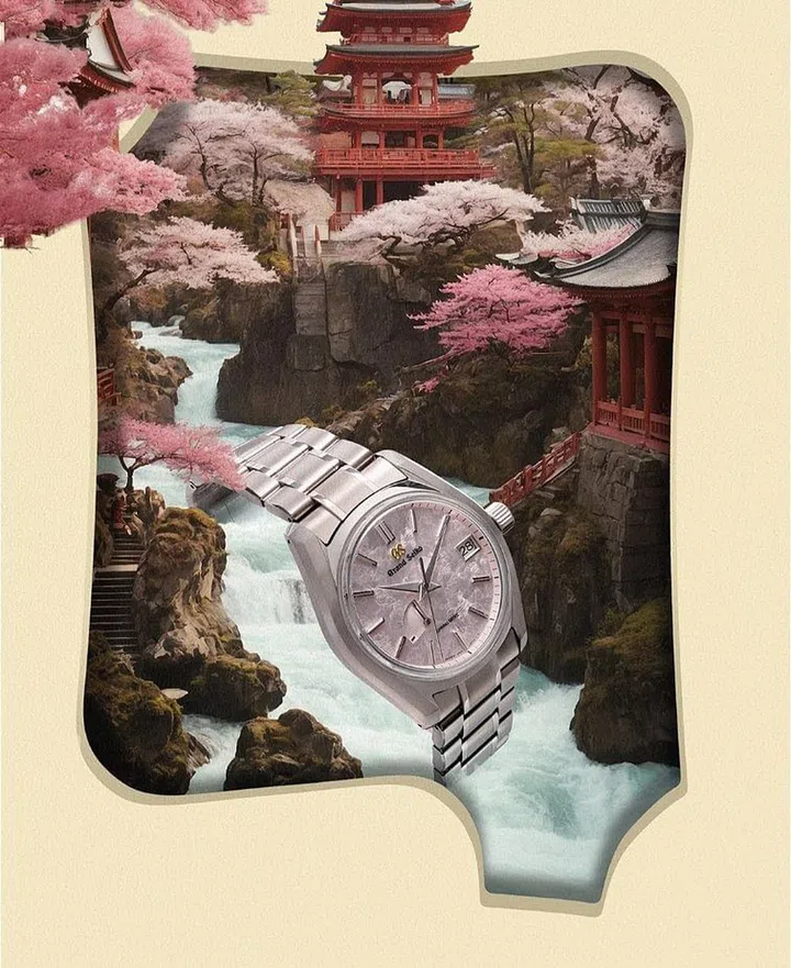 结合经典和式美学或独特风物景致的特殊表盘,是冠蓝狮(Grand Seiko)的招牌特色。其中,SBGA413腕表捕捉了日本二十四节气中“春分”时节这美丽却短暂的绝景。呈现灰粉色的岩石纹理表盘,描绘樱花花瓣落在河面上时,如羽绒般舞动漂浮的浪漫景致。至于腕表所采用的62GS表壳,是以1967年冠蓝狮发表的首款自动上链机械腕表“62GS”为蓝本,在2015年品牌55周年时,以现代美学观点重新演绎诠释的经典壳型。